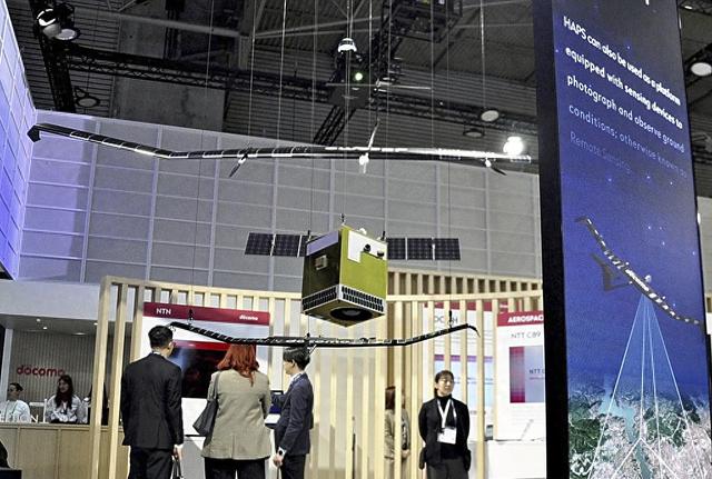 当地时间2025年3月4日,在西班牙巴萨罗那的全球移动通信大会上,NTT DOCOMO展位展出了类似滑翔机的